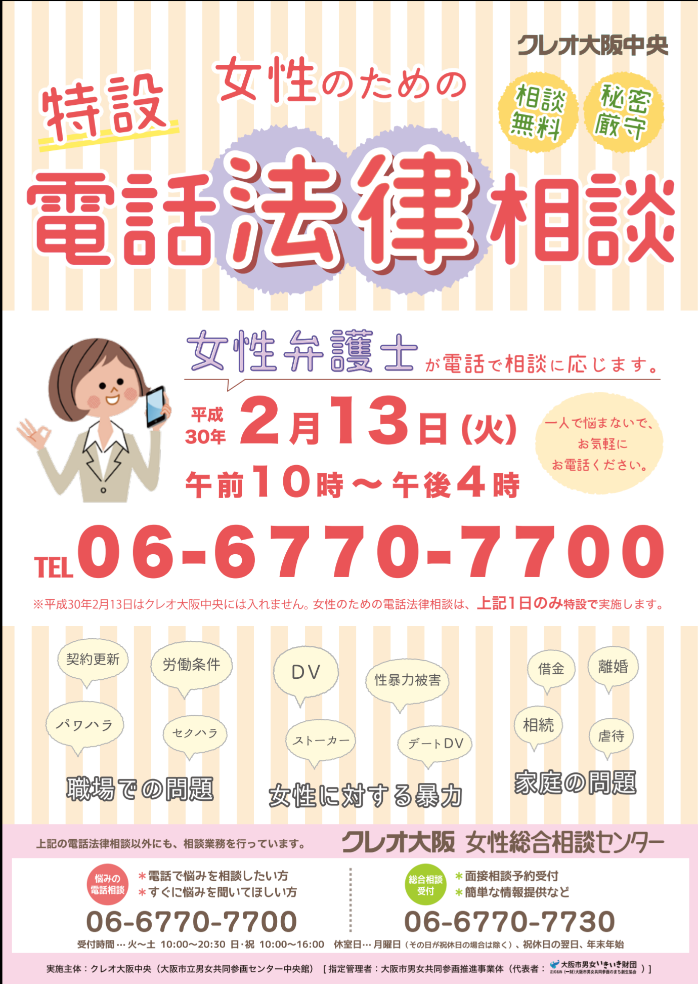 女性のための特設電話相談@クレオ大阪中央のご案内 イベント 2018.02.122018.05.01 平成30年2月13日(火)午前10時~午後4時まで、クレオ大阪中央にて、女性のための特設電話相談が開催されます。 法律相談に行くことが難しい女性の方は、ぜひご利用ください。